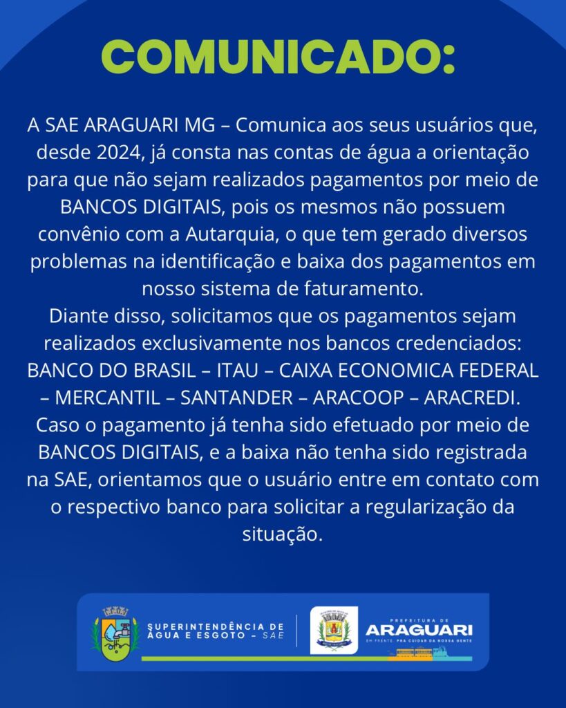 Confira informações referente a pagamentos por meio de BANCOS DIGITAIS: