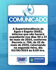 A Superintendência de Água e Esgoto (SAE), informa que não haverá expediente nos dias 30 e 31 de maio de 2024, conforme Decreto n.706, de
