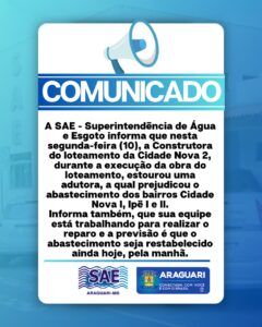 A SAE – Superintendência de Água e Esgoto informa que nesta segunda-feira (10), a Construtora Nova 2, durante a execução da obra do loteamento, estourou