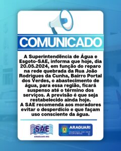 A Superintendência de Água e Esgoto – SAE, informa que hoje, dia 20.05.2024, em função do reparo na rede quebrada da Rua João Rodrigues da